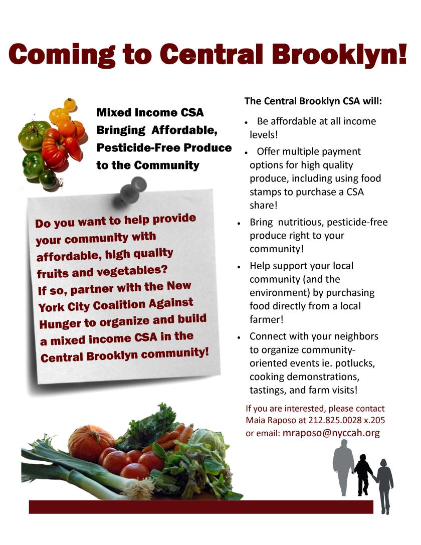 The Central Brooklyn CSA (CBCSA) is dedicated to working with our partners the New York City Coalition Against Hunger, Windflower Farm, and the Hebron French Speaking SDA Church to continue the work of building a Community Supported Agriculture model that increases access to fresh, local produce for all members of our communities, regardless of income level. Join us as we continue to bring fresh, organic, affordable and nutritious vegetables and fruit to the Bed-Stuy, Crown Heights, and surrounding communities. View all posts by Central Brooklyn CSA
