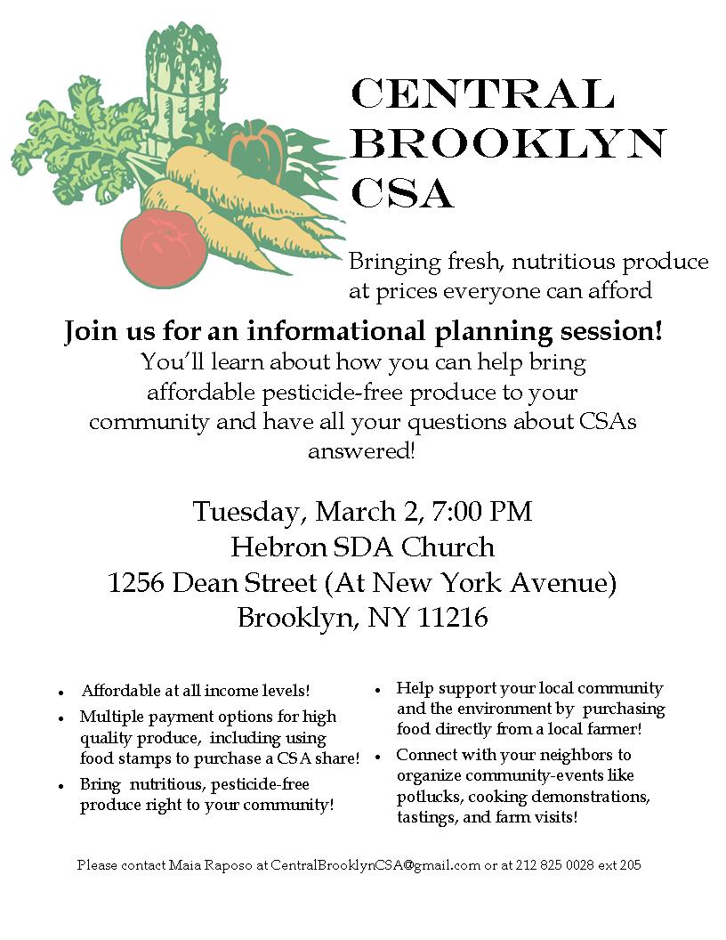 We will be having our next meeting on March 2, at 7 PM. The meeting will be held again at Hebron SDA Church, 1256 Dean Street, Brooklyn NY. If you have any questions at all, please contact Maia Raposo at CentralBrooklynCSA@gmail.com, or at 212 825 0028 ext 205.