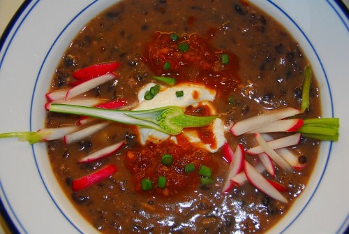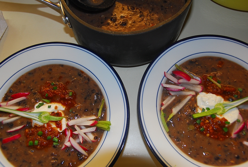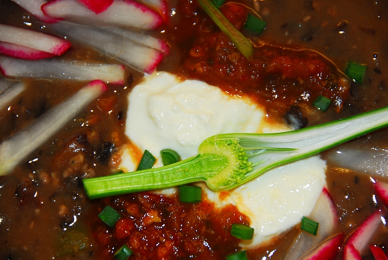 Radishes, garlic scapes, goat yogurt, chipotle salsa on home made black bean soup