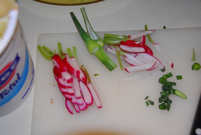 Slicded radishes and garlic scape