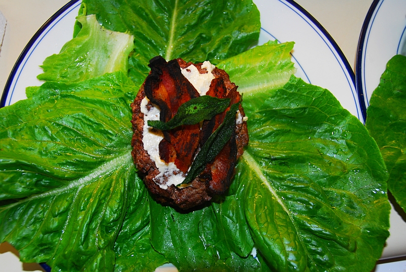 Turkey burger topped with goat yogurt, bacon, roasted sage and wrapped in lettuce leaves – no bun