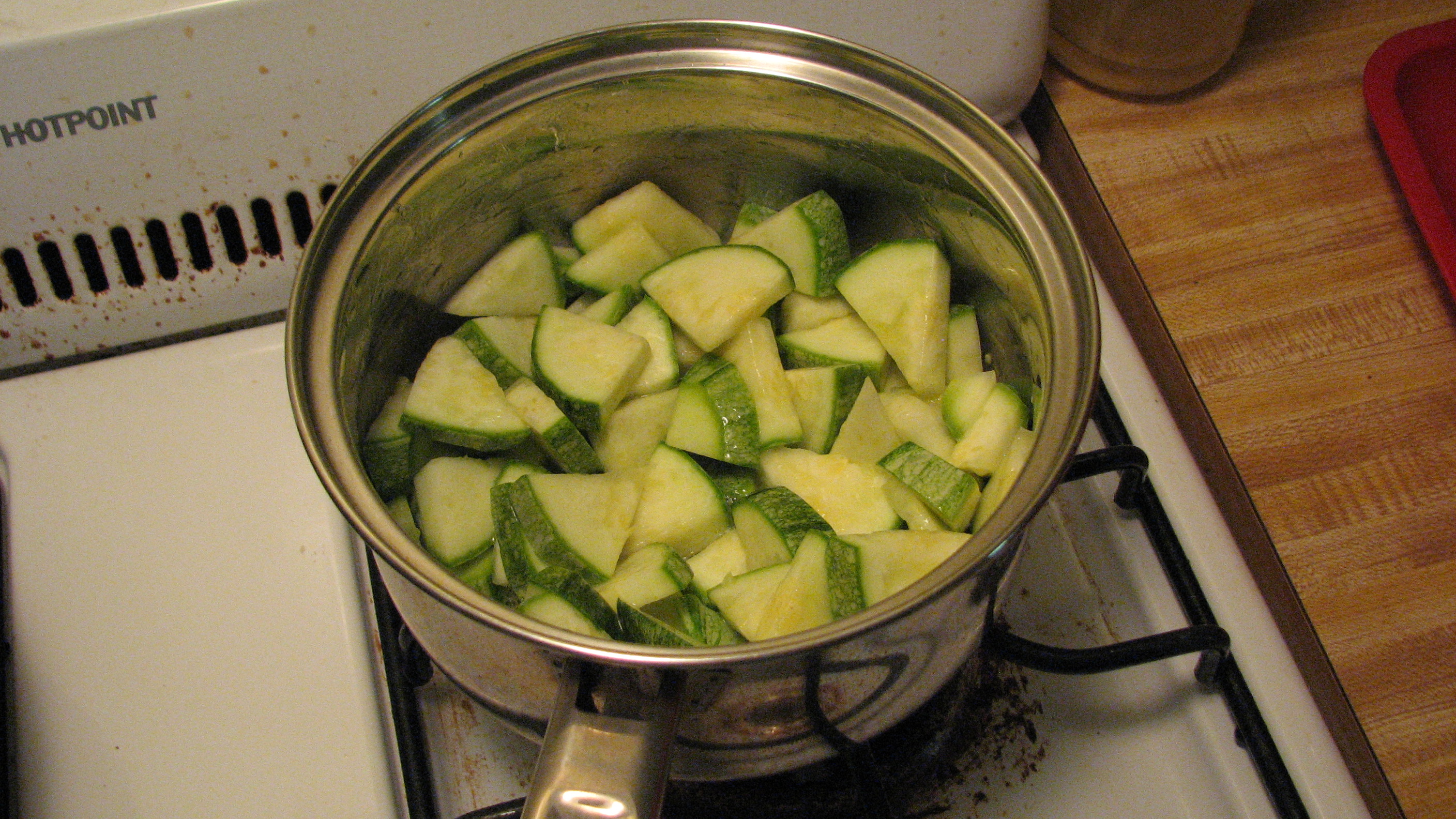 1. Wash zucchini, trim ends, and slice in half lengthwise, then slice each half lengthwise again to make quarters. Slice each quarter into ½ inch pieces.