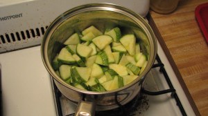 2. Heat oil and butter in large pot over medium heat until butter melts. Add sliced zucchini and sauté for 5 minutes, stirring gently. Add the warm water, salt, and a few twists of black pepper. Bring to boil, then lower the heat a bit and boil gently for 10 minutes.