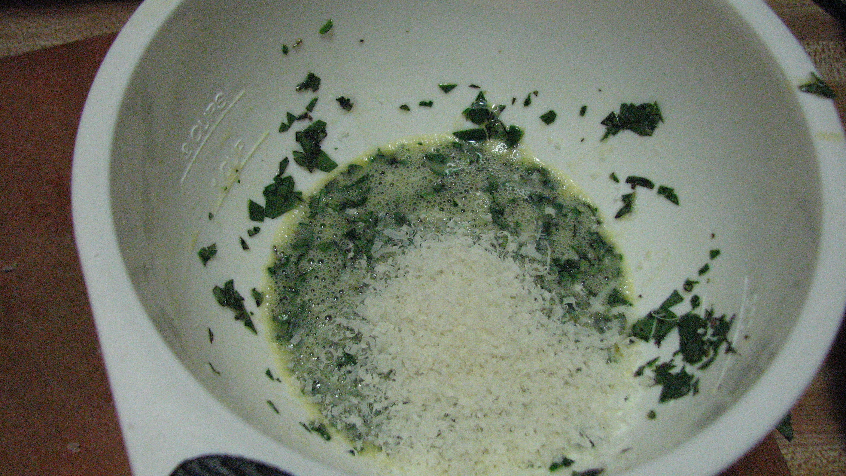 3. While your soup is boiling, beat the eggs; then add the parsley, basil, and cheese, and mix well.