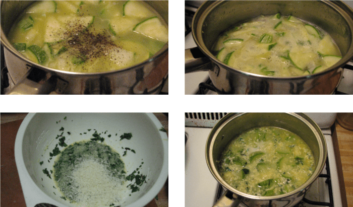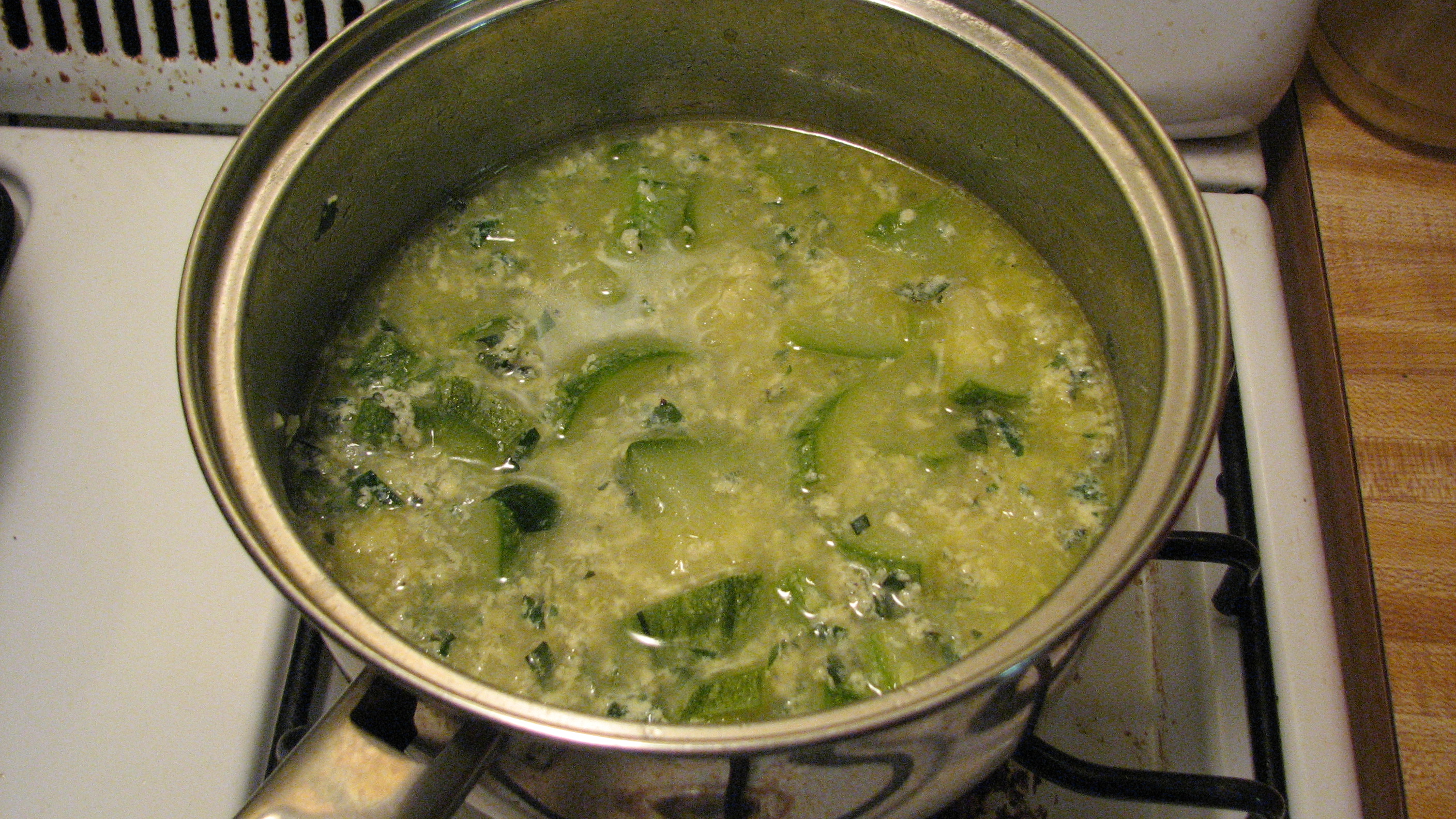 4. When zucchini are cooked, pour egg-cheese-herb mixture into the bubbling soup and stir with a whisk. Turn off the heat when the eggs are cooked and floating throughout the soup.