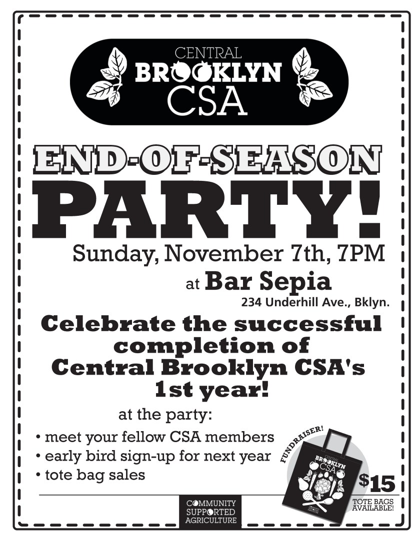As your luck would have it, both of those things come together at 7pm, Sunday November 7th! It’s true, the Central Brooklyn CSA (serving Bed Stuy, Crown Heights, and surrounding areas) is having its first End of Season Party (or as we like to call it,” the Blowout Bash, the Premier Part-tay Around the Way, the Mega Mixer, the Super Soiree, the Best Fest, Get Your Groove On Dot Com”) at Bar Sepia. Join us. Shake your groove thang.